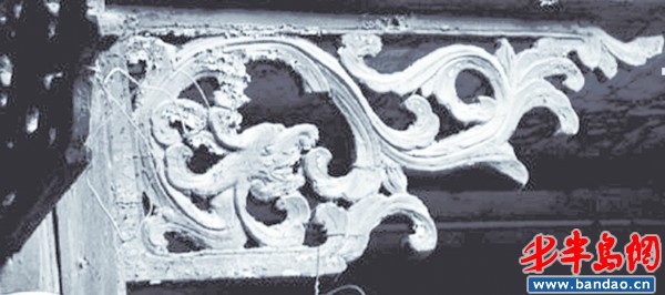 陵县路上老楼木廊上镂空的木雕”龙纹饰”。