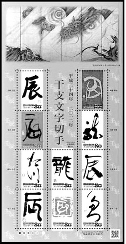 作为世界上首先发行生肖邮票的国家,日本的生肖邮票一向以艺术感强、文化气息浓厚著称。11月11日,日本邮政首先发行“龙年贺年邮票”全套4枚,这套邮票以乡土玩具为素材设计而成。其中,尤为引人关注的是11月21日发行的“干支文字小版张系列”第8组“壬辰龙年邮票”10枚。10枚邮票分别展示了日本10位著名书法家用不同字体书写的龙字,小版张的背景图案为日本早期著名画家狩野山乐的作品《龙虎图屏风》。