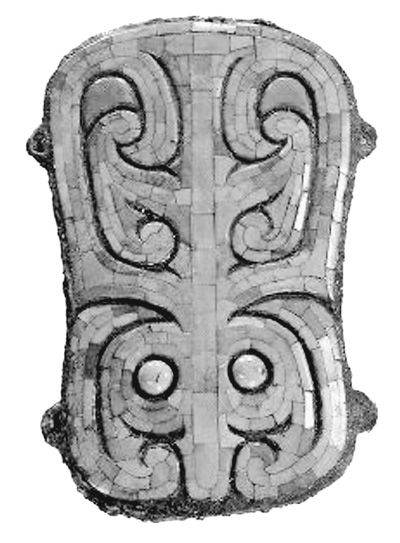 在这次展览中,最精美的文物是一件发现于二里头的绿松石铜牌。绿松石铜牌最早见于甘肃、河南与四川,是玉石工艺和冶金技术巧妙结合的产物,标志着东西方金玉文化的结缘。二里头的嵌绿松石兽面纹铜牌,是一种极具二里头文化特色的艺术品,以青铜铸出的圆角凹腰状的牌体正面弧凸,其上铸出兽面纹。目前已出土了3件,都是贵族墓的随葬品。这类器物一般出土于墓主人的胸腹部附近,两侧各有两个穿孔的纽,或许是缝于衣服上的。这样的兽面纹与商代的青铜器上的龙纹十分相似。