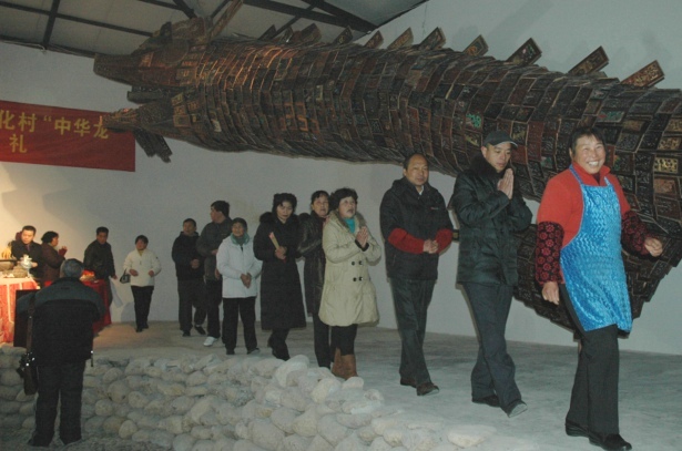 新建成的中华龙宫建筑面积近千平米,内部九根龙柱支撑起整个龙宫。100多吨长江鹅卵石组成的龙门和背景装饰庄重肃穆,映衬出龙宫的主角——中华龙。此次开光的“中华龙”是由5000片50年到500年的传统雕花木板建构而成,象征中华五千年的文明史;全长36米,以九为计。江南历代能工巧匠作为龙的传人,制作了这些用于古代居家的木雕板,睿智的三民文化中心主任范敬贵先生,在此基础上创意设计制作了这条体现民族精神的“中华龙”。