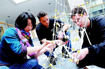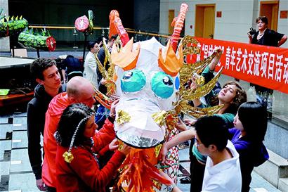 该活动由湖北经济学院和德国波茨坦开放艺术协会共同组织,旨在增进与中国艺术家和青年的交流,探索中欧青年艺术家合作形式。上图:中欧青年艺术家共同制作“龙”。左图:齐心协力做“龙”架。(通讯员杨宏斌摄)