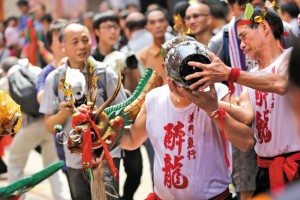 无论是中山还是澳门的“舞醉龙”,形式与仪式都几乎相同。舞起的醉龙均分为龙首与龙尾两部分,当然舞龙首者是主角,他们都保持着“形醉意不醉,步醉心不醉”的舞姿。如有人觉得舞龙者不够“醉”,还可以递上酒埕或从旁强灌,务必使舞龙者带醉而舞。但也有说舞龙尾者才是“师傅”,在后面把握大局。