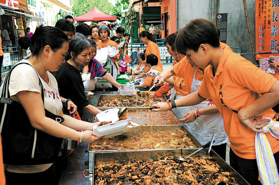 “舞醉龙”的游行队伍旁边总会有人摆出“龙船头饭”,又叫“长寿饭”,免费派送给观龙的人。据说吃了“龙船头饭”的人,便能够长命百岁、丁财两旺。(供图/东方IC)