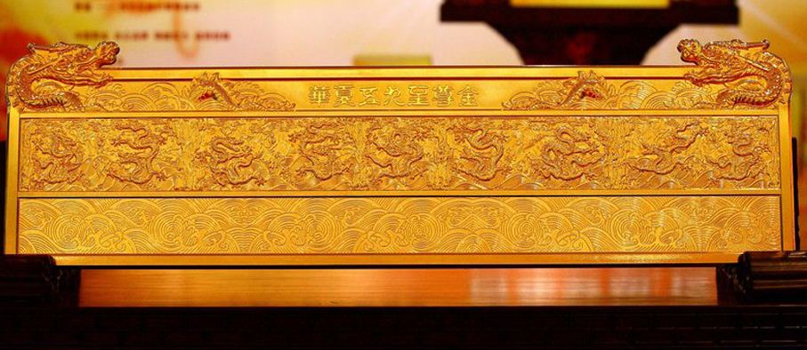 据介绍,这个金块被称为:“华夏五九至尊金”,长99.999厘米,高26厘米,厚1.8厘米,重99.999公斤,也就是说差0.001公斤就是100公斤,纯度高达 99.999%,被授予吉尼斯(由上海大世界1922年创办,记录世界之最)“最重的高纯金 (Au99.999) 雕刻作品”。黄金的壁面的九条龙是取材于北京的九龙壁,由10位工艺美术大师耗时一个多月的时间雕刻而成的工艺品,按市场价格光金价就值4000多万元人民币,要是论工艺品,那价值就更高了。